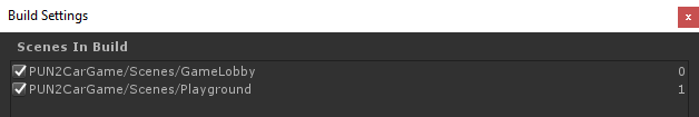 - Tilføj både GameLobby- og Playground-scener til Build-indstillingerne: