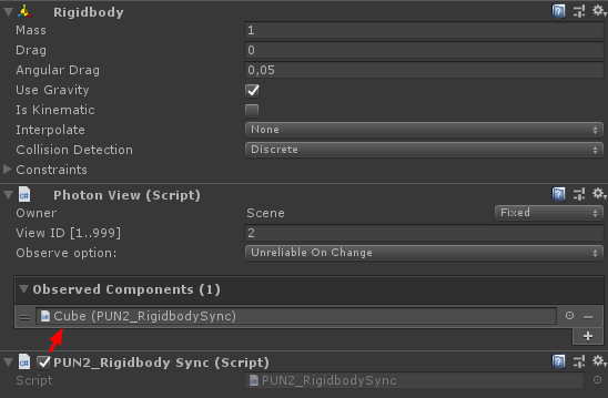 }- Vedhæft PUN2_RigidbodySync til begge terninger, og tildel den også til Photon View "Observed Components":