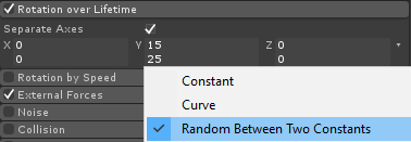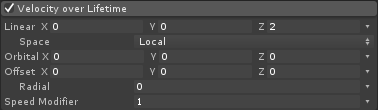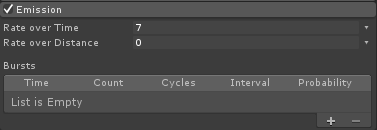 - Aktiver disse moduler i partikelsystemet: Emission, Form, Hastighed over levetid, Farve over levetid, Størrelse over levetid , Rotation over levetid, Eksterne kræfter, Gengiver.