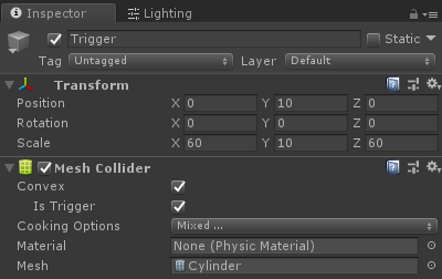 - Tilføj MeshCollider-komponent til "Trigger" GameObject, marker afkrydsningsfelterne Convex og IsTrigger, og skift dens Mesh til standardcylinder